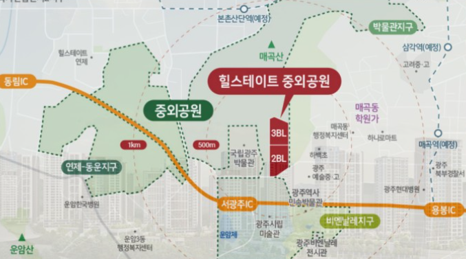 단지가 지어질 곳인 중외공원은 박물관과 비엔날 및 어린이대공원, 연제~동운 등 4개 지구로 나늰 테마를 가진 대형 공원으로 지역 내 구축, 신축을 통틀어 거주 쾌적성 면에선 으뜸일 것 같으며 기반 시설 같은 경우엔 아쿠아시티와 병의원, 공공기관, 은행 등이 자리한 매곡동 일대 중심상권이 지근거리의 인프라들 같습니다.