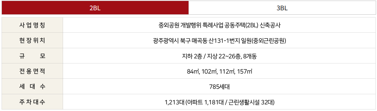 두 개 블록(2블록 - 지하 이층, 지상 이십이 층~이십육층, 여덟 개동, 총 칠백팔십오 세대, 3블록 - 지하 사층, 지상 이십이 층~이십팔층, 일곱 개동, 육백팔십일 세대)로 나뉘어 있으며 전용 84형, 102형, 112형, 157형 등 중대형 면적들로만 구성되어 있습니다.